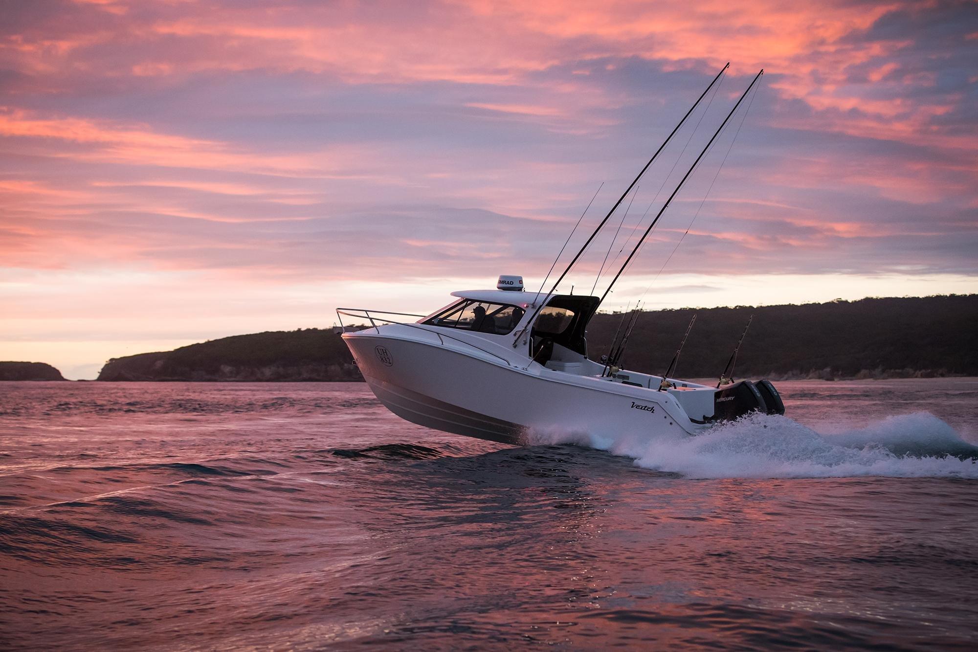 The Veitch 27 commands attention both at the ramp and on the water. Its innovative hull features a 25.5-degree dead-rise that extends gracefully into a bow exceeding 50 degrees, accented by a prominent flare. Rounded reverse chines not only enhance stability at rest and in motion but also ensure fast, predictable turning performance.